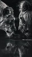 Dit kunstwerk toont een intiem moment tussen twee leeuwen, een mannetje en een vrouwtje, die elkaar recht aankijken boven een kalm wateroppervlak.