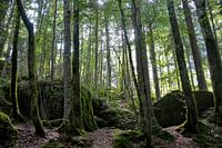 Uitzicht op het mystieke bergbos bij Blausee in het Berner Oberland in Zwitserland