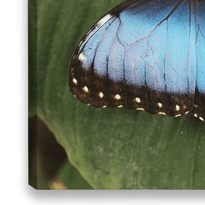 Foto van een blauwe vlinder op een groen blad. Deze foto is ideaal voor een tuinposter /tuinposters.