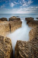 Rotsen aan de zee bij Portugal in de regio Algarve, gefotografeerd met een lange sluitertijd.