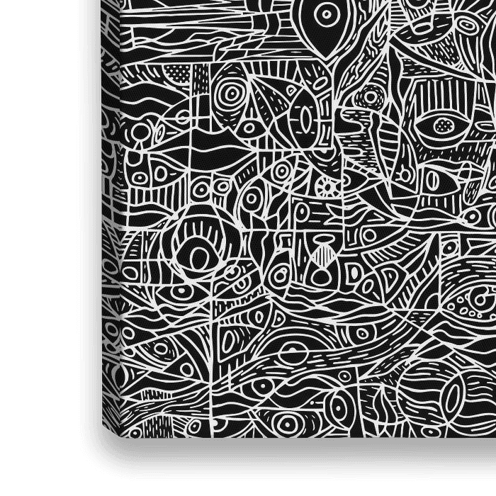 Dit hand gemaakte kunstwerk is een intrigerende compositie van abstracte lijnen en vormen, die een chaotische maar harmonieuze visuele ervaring creëren. Met een zwart-wit kleurenpalet straalt het een sterke grafische impact uit, waarbij de witte lijnen op de zwarte achtergrond een dynamische energie oproepen. De afbeelding zit vol met ogen, gezichten en mysterieuze symbolen, wat een gevoel van constante observatie en onderbewuste betekenissen oproept. Er lijken elementen van surrealistische en tribale kunst te zijn verwerkt, waardoor de kijker wordt uitgedaagd om verbanden te leggen en eigen interpretaties te vormen. De overlapping van vormen en de ononderbroken stroom van patronen suggereren een innerlijke chaos, een weerspiegeling van gedachten, emoties en verborgen werelden. Dit werk nodigt uit tot diepere beschouwing en biedt telkens nieuwe details om te ontdekken, waardoor het een fascinerend en meeslepend kunstwerk is.