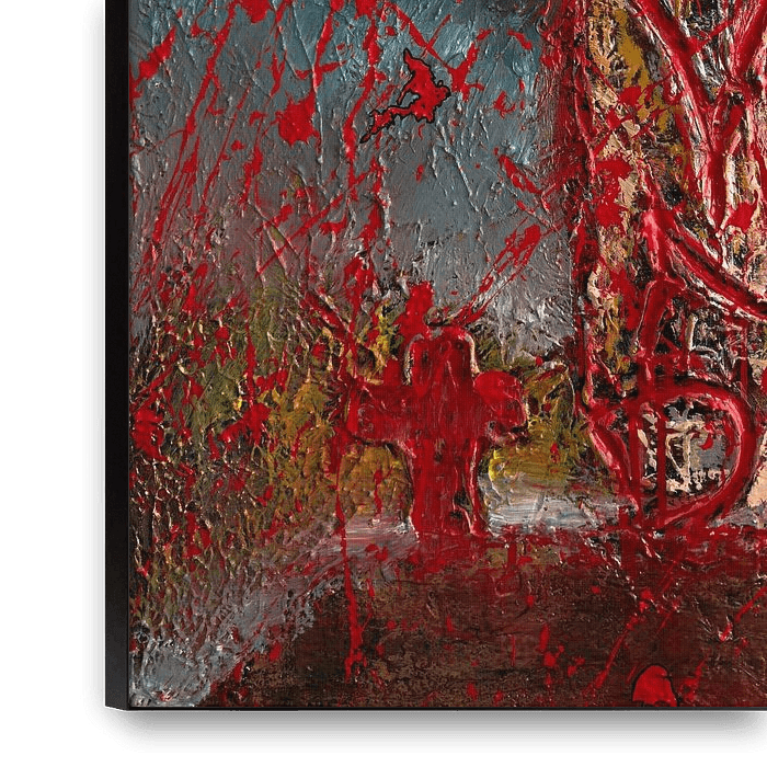 De ruwe structuur en de intense rode verf zorgen voor een gevoel van beweging en spanning. Tegelijkertijd blijft het werk in…