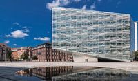 Gebouw the Crystal aan de Hambrosgade in Copenhagen reflecteert in een plas.