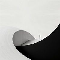 Een figuur beweegt tussen licht en schaduw in een architectonische golf. Een symbolisch beeld over beweging, balans en contrast.