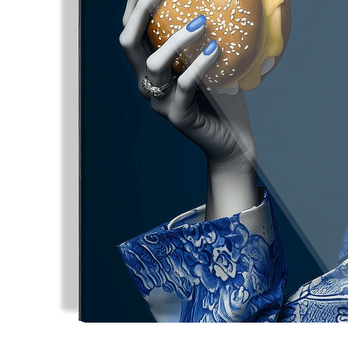 Dit digitale kunstwerk is een gedurfde en speelse herinterpretatie van Meisje met de parel, waarin klassieke elegantie wordt gecombineerd met moderne popcultuur. De Delfts blauwe patronen in haar kleding en hoofddoek contrasteren met de hyperrealistische cheeseburger in haar hand. Haar intens blauwe lippen en nagels versterken de…