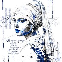 Dit digitale kunstwerk is een moderne en expressieve herinterpretatie van Vermeers Meisje met de parel. De compositie combineert abstracte texturen, Delfts blauwe patronen en subtiele digitale vervormingen, waardoor een gelaagde en dynamische uitstraling ontstaat. De blauwe accenten in haar ogen en lippen versterken haar mysterieuze…