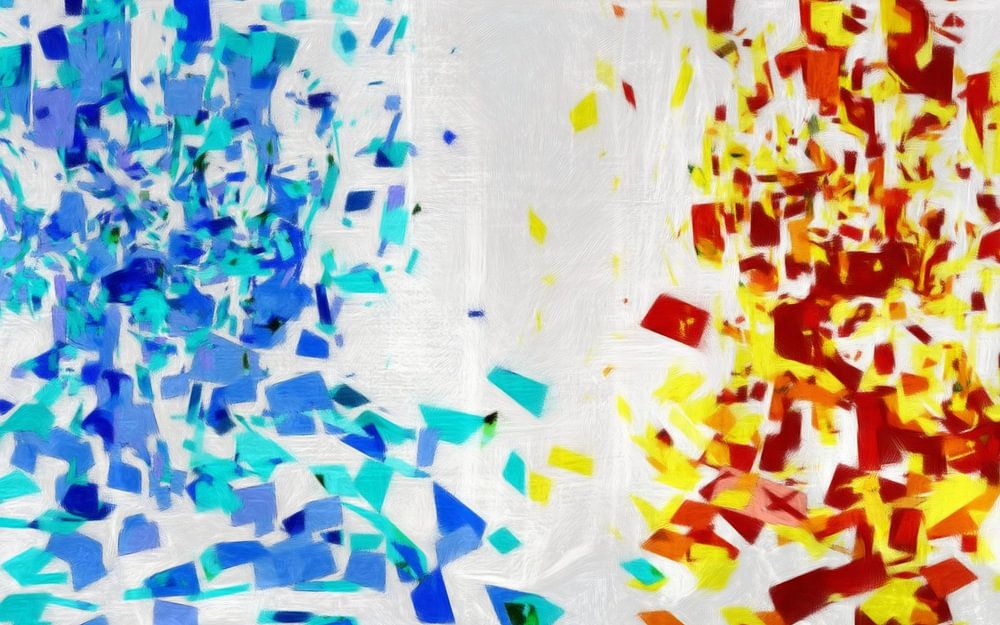 The Destruction Of Humanity II abstract digitale gouache schilderij met vrouwelijk en mannelijke hoofden die geëxplodeerd is op een wit en grijs achtergrond