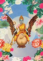 Een krachtig, kleurrijk en botanisch portret van de hindoegodin Sarasvati.