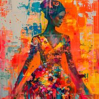 Een kleurrijk portret van een elegante vrouw in haute couture, met abstracte neonkleurspatten en bloemenpatronen op haar jurk. Ze staat tegen een levendige achtergrond, wat een gevoel van beweging en energie creëert.