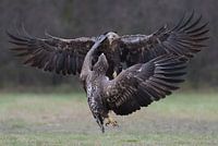 Klein geschil tussen twee zeearenden, vergezeld van veel geschreeuw en een dreigende houding, op een open veld in een bos in het midden van Polen.