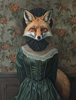 Dit schilderij toont een portret van een vixen, een vrouwtjesvos, gekleed in middeleeuwse jurk.