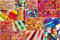 Een compilatie van garen, band, veters, lint, wol en knopen. Een kleurrijke collage met als basis de ultieme bron voor het begrip fashion en mode. Een prachtige en vrolijke collage! Heel leuk voor in een atelier of iemand die van kleuren houdt.