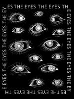 Dit zwart-witte kunstwerk toont een reeks handgetekende ogen, elk met een eigen vorm en expressie. De schetsmatige stijl en het hoge contrast geven het werk een rauwe en directe uitstraling. Rondom de illustraties staat de herhalende tekst “The eyes”, die het gevoel van constant kijken en bekeken worden versterkt.