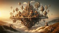 Dit indrukwekkende kunstwerk met de titel The Floating City toont een majestueuze steampunkstad die hoog boven een bergachtig landschap zweeft, gedragen door een complex netwerk van gigantische tandwielen, metalen constructies en mechanische aandrijvingen. De architectuur is een verfijnde mix van Victoriaanse en Gotische stijlelementen,…