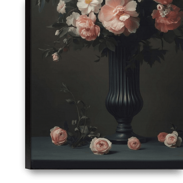 In dit digitale stilleven staat een elegante, hoog vormgegeven zwarte vaas centraal, gevuld met een weelderig boeket in zachte perzik- en crèmekleuren. De bloemen lijken met aandacht gerangschikt, maar gedragen zich met een natuurlijke, bijna instinctieve sierlijkheid. Enkele rozen zijn naar beneden gezakt en liggen op het tafelblad,…