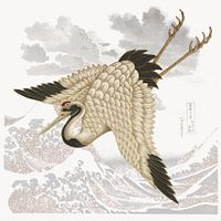 Een kraanvogel vliegt boven de golven van de zee.