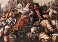 Dit volwassen werk uit de laatste jaren van de Beuckelaer volgt een compositorisch type dat door de kunstenaar in de loop van zijn carrière is geperfectioneerd. Door zijn doek in drie zones te verdelen, schildert hij op de voorgrond een uitgestrekt stilleven, gevolgd door figuren in Vlaamse kledij, en doorspekt met een stadsgezicht. Kenmerkend voor Beuckelaer is dat hij de architectuur op de achtergrond even behendig schildert als een van zijn stillevens.