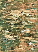 Abstract schilderij van een moderne stad met veel licht, het lijkt zo op een gouden stad. De wegen kruisen door de stad heen , hier en daar zie je nog wat groen en water. Het is net een foto vanuit de ruimte.