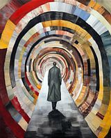 Abstracte kleurrijke symbolische kunst met een man die door een lange tunnel loopt op weg naar....