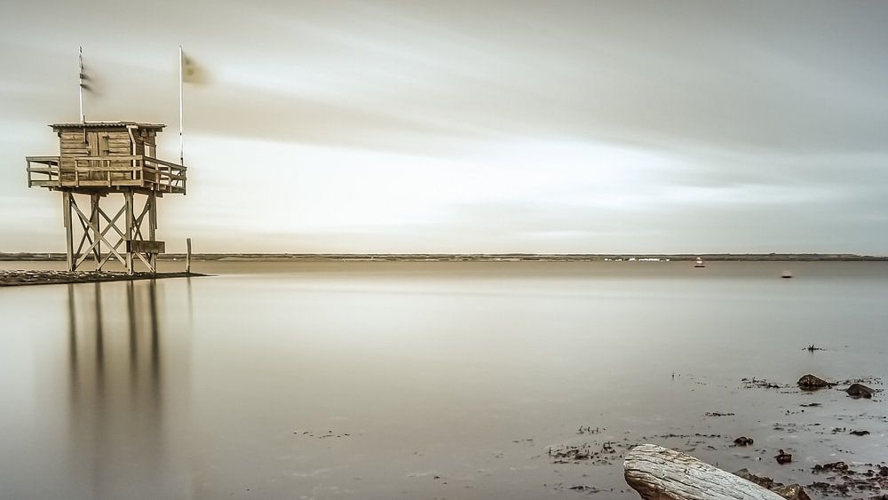 Strandwacht huisje bij de duikplaats van Scharendijke aan het Grevelingenmeer. Door de lange sluitertijd is er beweging in de lucht te zien en het water verstild.
