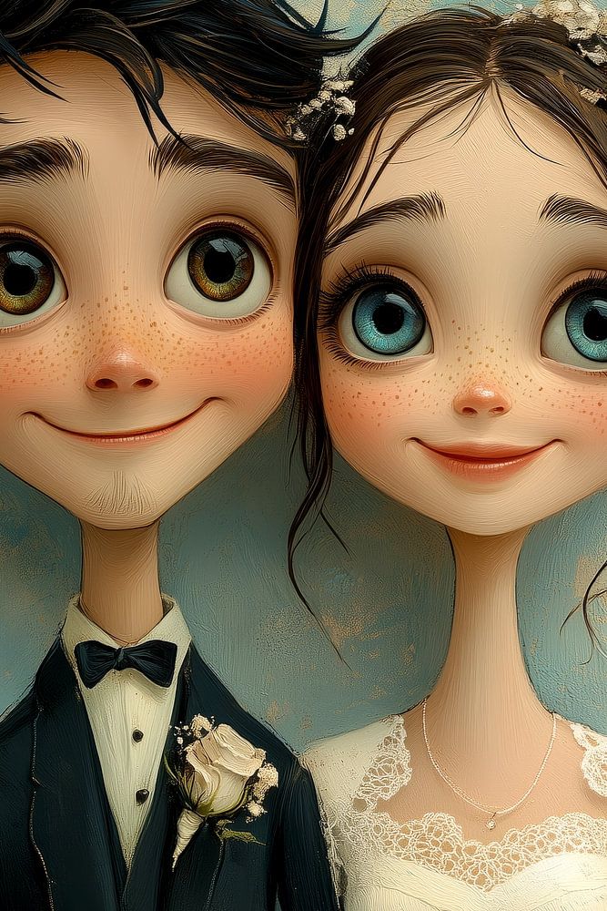 Dit schilderij toont een charmant en vrolijk bruidspaar in een speelse, pop-surrealistische stijl. Beide figuren hebben grote, expressieve ogen en een lieve glimlach die de vreugde van hun grote dag weerspiegelt. De bruidegom draagt een zwart pak met een witte roos in zijn knoopsgat en een strikje, terwijl de bruid straalt in een witte jurk met fijne kanten details. Om hen heen bloeien gele en oranje bloemen uitbundig tegen een blauwe achtergrond, wat het schilderij een zonnige en feestelijke sfeer geeft. De artistieke penseelstreken en de zachte kleuren creëren een warme, dromerige uitstraling.