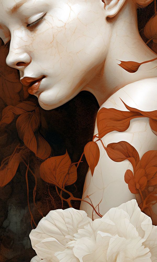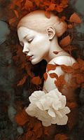 Portret van een vrouw in voornamelijk roestbruin, groen en gebroken wit tinten.