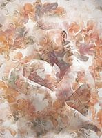 Een gebroken man en vrouw in innige omhelzing omringd door bloemblaadjes.