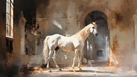 Een kunstwerk van een paard die in een oude verlaten kasteel hal staat met zonlicht dat door de ramen naar binnen stroomt, stof en puin bezaaien de grond. Door de zachte tinten en warm licht wordt de elegante houding van het paard benadrukt, in de stijl van een klassieke meester.