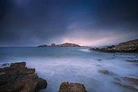 Gefotografeerd met een lange sluitertijd, hierdoor wordt het water mooi melkachtig/ glad. De wolken geven een dramatische sfeer met nog wat mooie kleuren van de zonsondergang bij het eiland.