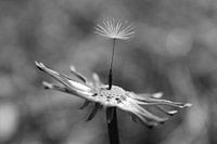 Close up foto van één zaadje van een uitgebloeide paardebloem (zwart/wit).