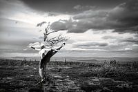 The Last Stand is een krachtig zwart-wit kunstwerk dat de essentie van kracht en kwetsbaarheid op een visueel indrukwekkende manier vastlegt. In een uitgestrekt, verlaten landschap staat een eenzame danseres in een sierlijke pose, met haar armen wijd gespreid en haar been hoog in de lucht. De boom naast haar, ogenschijnlijk net zo fragiel en eenzaam, lijkt haar spiegelbeeld te zijn, waarbij beide figuren vastberaden standhouden in een desolate omgeving.
