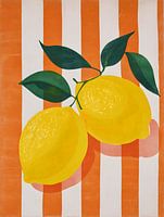 Twee citroenen op een oranje-wit gestreepte achtergrond. Frisse, zomerse energie met een vleugje vintage flair.