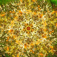 Een caleidoscopisch werk, gekaamt door het vijf keer over elkaar leggen en roteren van een foto. Op die foto is een veld met wilde bloemen te zien, waaronder de donzige restanten van distels, aan het einde van de zomer.