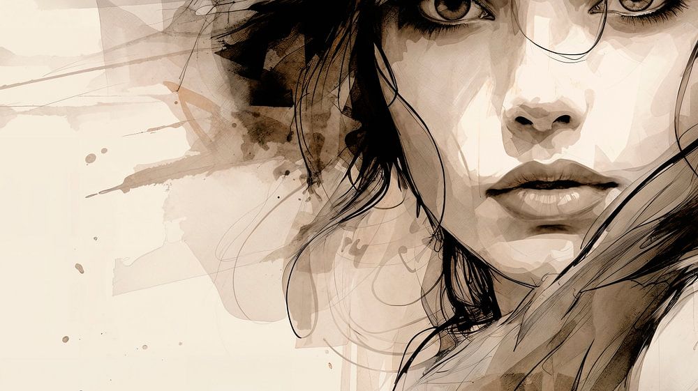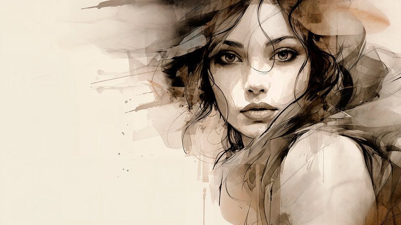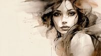 Een portret van een jonge vrouw afgebeeld met een mix van aquarel en inkt met de nadruk op zachte vloeiende lijnen. Haar gezicht heeft een serene uitdrukking, waarbij haar grote, expressieve ogen de aandacht van de kijker trekt. Abstracte penseelstreken en verfspatten omringen haar en versterken het dromerige karakter van het werk.