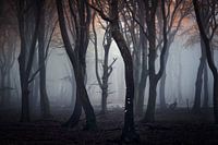 Een dikke laag met mist in het Speulderbos geeft het bos een mysterieuze sfeer.