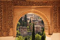 Moors raam met een doorkijk op de oude binnestad van Granada.