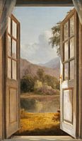 Een doorkijkje door openstaande deuren naar een landschap met begen en weides.