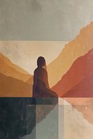 Een minimalistisch kunstwerk dat rust en contemplatie uitstraalt, waarbij een silhouet in meditatiehouding uitkijkt over een sereen berglandschap in warme aardetinten. Het spiegelende wateroppervlak creërt een perfect symmetrische compositie die doet denken aan innerlijke balans en spirituele verbinding met de natuur.