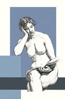 Pentekening van een naakte, lezende vrouw, zittend op een achtergrond van diverse vormen en verschillende koele tinten kleuren blauw.