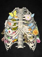 Een menselijke ribbenkast, gevuld met bloemen en vlinders. Klinkt griezelig, maar is het niet.