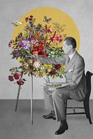 Een digitaal vervaardigde collage met daarin verwerkt een vintage foto van een kunstschilder en vintage afbeeldingen van bloemen en vlinders.