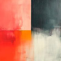 Een minimalistisch abstract kunstwerk met grote, opvallende kleurblokken die overgaan in kleine penseelstreken van wit. De compositie is eenvoudig maar krachtig en roept gevoelens van passie en intensiteit op.