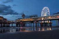 Mooie reflecties op het natte zand van de verlichte Pier en reuzenrad in Scheveningen.