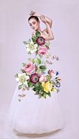 Op het eerste gezicht lijkt het alsof de vrouw een prachtige jurk draagt die bezaaid is met bloemen en omgeven is door vlinders, maar als u goed kijkt, kunt u zien dat de natuur haar leven aan het overnemen is.