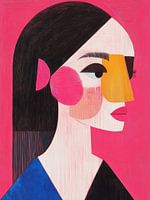Een expressief en modern portret met een dynamische mix van felle kleuren en geometrische vormen. De vrouw is afgebeeld in een gestileerde, abstracte stijl met contrasterende roze en gele accenten op haar gezicht, wat haar blik extra krachtig maakt. De combinatie van strakke lijnen, rijke texturen en het gebruik van blauw en zwart geeft…