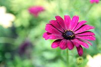 Foto van een paarse margriet tegen een groene achtergrond. Deze foto is ideaal voor een tuinposter (tuinposters).