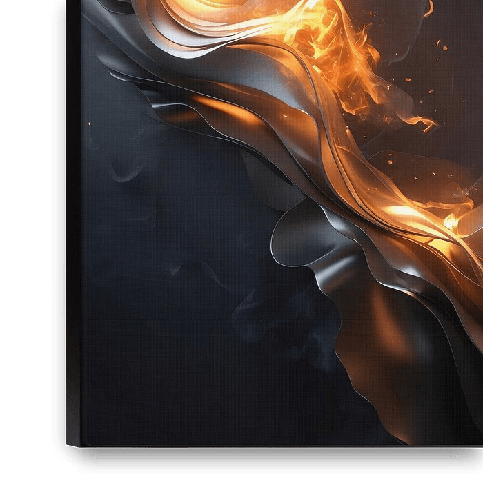 Geen hoge vlammen. Geen explosie. Alleen een geconcentreerde kern van hitte die zich omhoog beweegt als een ingehouden stroom. Gesmolten amber en geborsteld goud vloeien langs diepe, schaduwrijke lagen — alsof warmte onder controle blijft en daardoor juist…