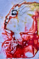 Een figuratief werk van zwart draad op plastic omhuld in rood, het gebruik van water geeft net zoals de losse draden een gevoel van vrijheid & beweging.