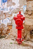 Een enkele rode brandkraan in een stedelijke omgeving in de straten van Setúbal in Portugal die met graffiti zijn besmeurd. Foto: Tony Taylor
