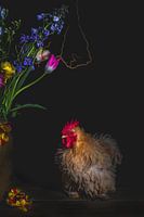 Een haan met zijn prachtig gekrulde veren speelt de hoofdrol in dit schilderachtige stilleven. De haan heeft een prachtige rode kam en is zeer ijdel. Prachtig gekleurde bloemen zoals tulpen en rozen in een gouden vaas. Echte Hollandse tulpen. Het licht is schilderachtig. Dit mooie strijklicht doet denken aan de oude schilder meesters.…